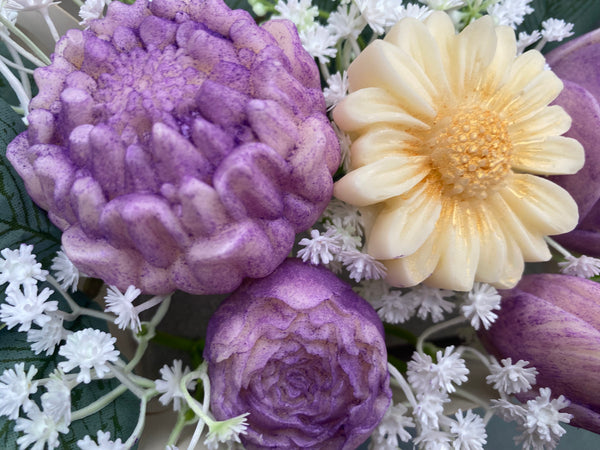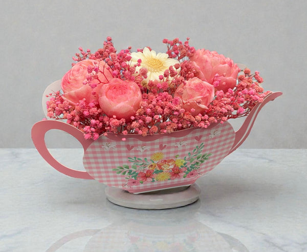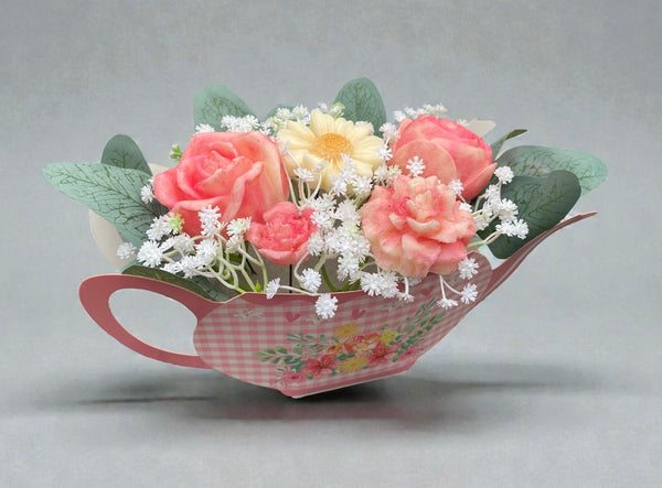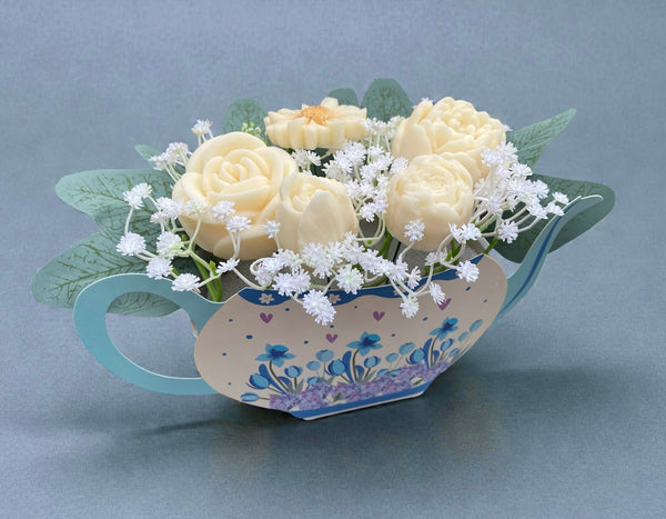 Beautiful flower bouquet presented in a cute teapot shaped box. Contains various wax flowers in the fragrance of Heavenly Nectar which is from the clean fragrance range. Comes in cellophane wrapping and ribbon trim. Perfect for all occasions
