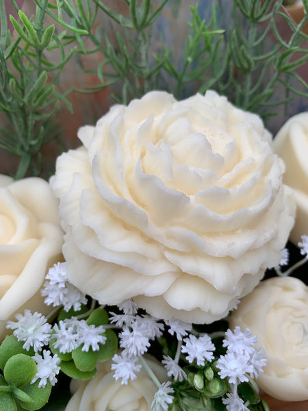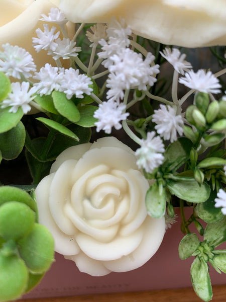 Beautiful flower bouquet presented in a gift box envelope. Contains various wax flowers in the fragrance of Petal and Strawberries, which is part of the clean fragrance rage. Comes in cellophane wrapping and ribbon trim