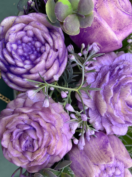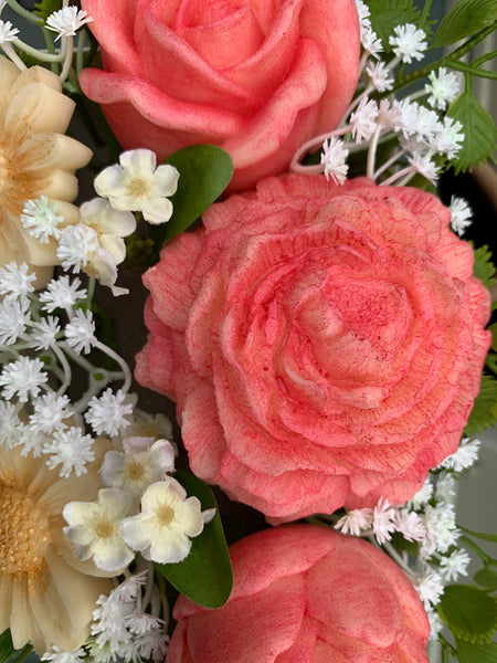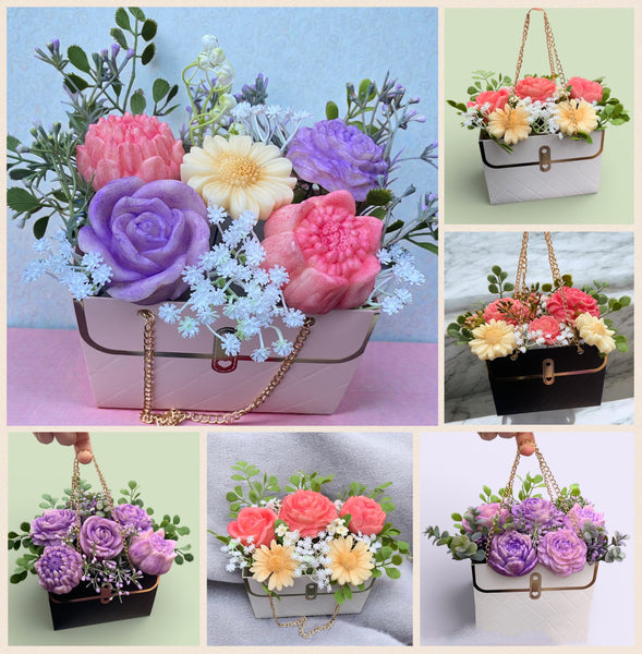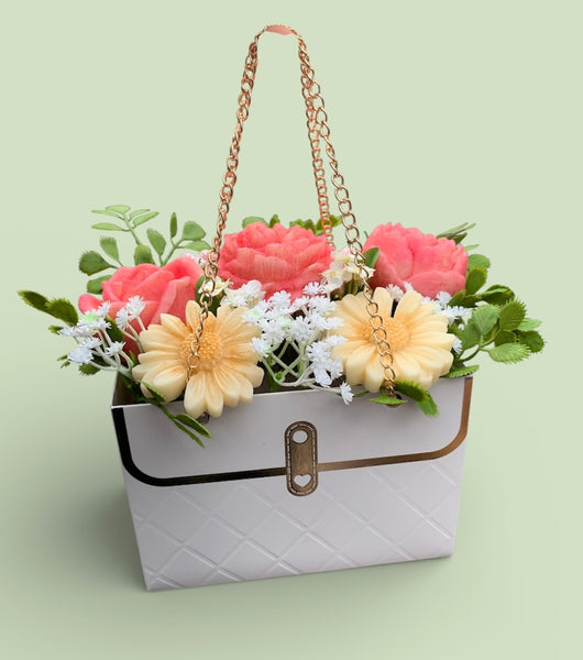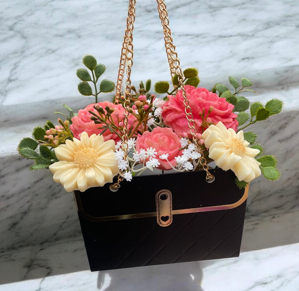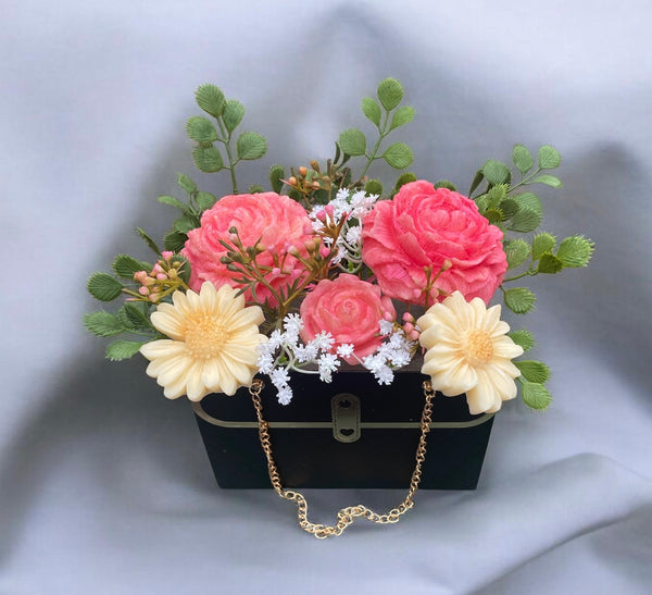 Beautiful flower bouquet presented in a fantastic handbag shaped box. Contains various wax flowers in the fragrance of Heavenly Nectar which is from the clean fragrance range. Comes in cellophane wrapping and ribbon trim. Perfect for all occasions