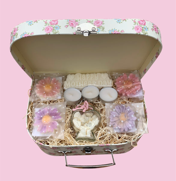 Presented in a reusable suitcase hamper, this gift set includes 4 fragranced daisy melts, a heart shaped jar that includes mini heart melts, a 'Happy Mother's Day' wax sentiment plaque and 3 plain tea lights.